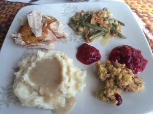 “Honey we shrunk the turkey.” So they made and stuffed a Cornish game hen which will make a nice lunch this week. Then the real turkey came out with mashed potatoes, scratch made green bean casserole, gravy, and two kinds of cranberry sauce.