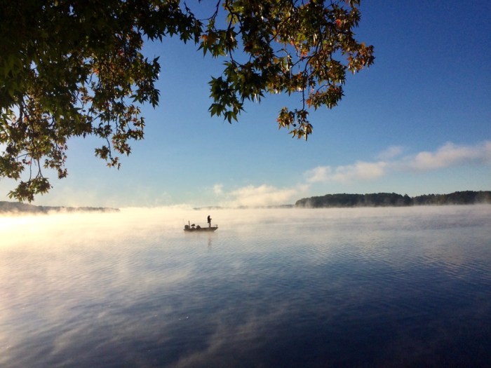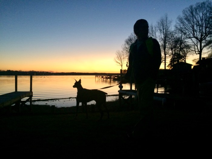 The first few weeks we enjoyed our relatively private campsite. Only one of our four neighbors was there full-time and he was a model neighbor. We were the only ones with a dog so Sadie spent evenings chasing her purple ball, taking long walks and just hanging out on her tie-down. We had the place to ourselves and just relaxed outside in our camping chairs after work, cooking, talking, and listing to music. I have family in the area so a few times we lucked out and got picked up by my cousin for a boat ride around the lake. We were starting to adapt to the new environment and enjoying it.
